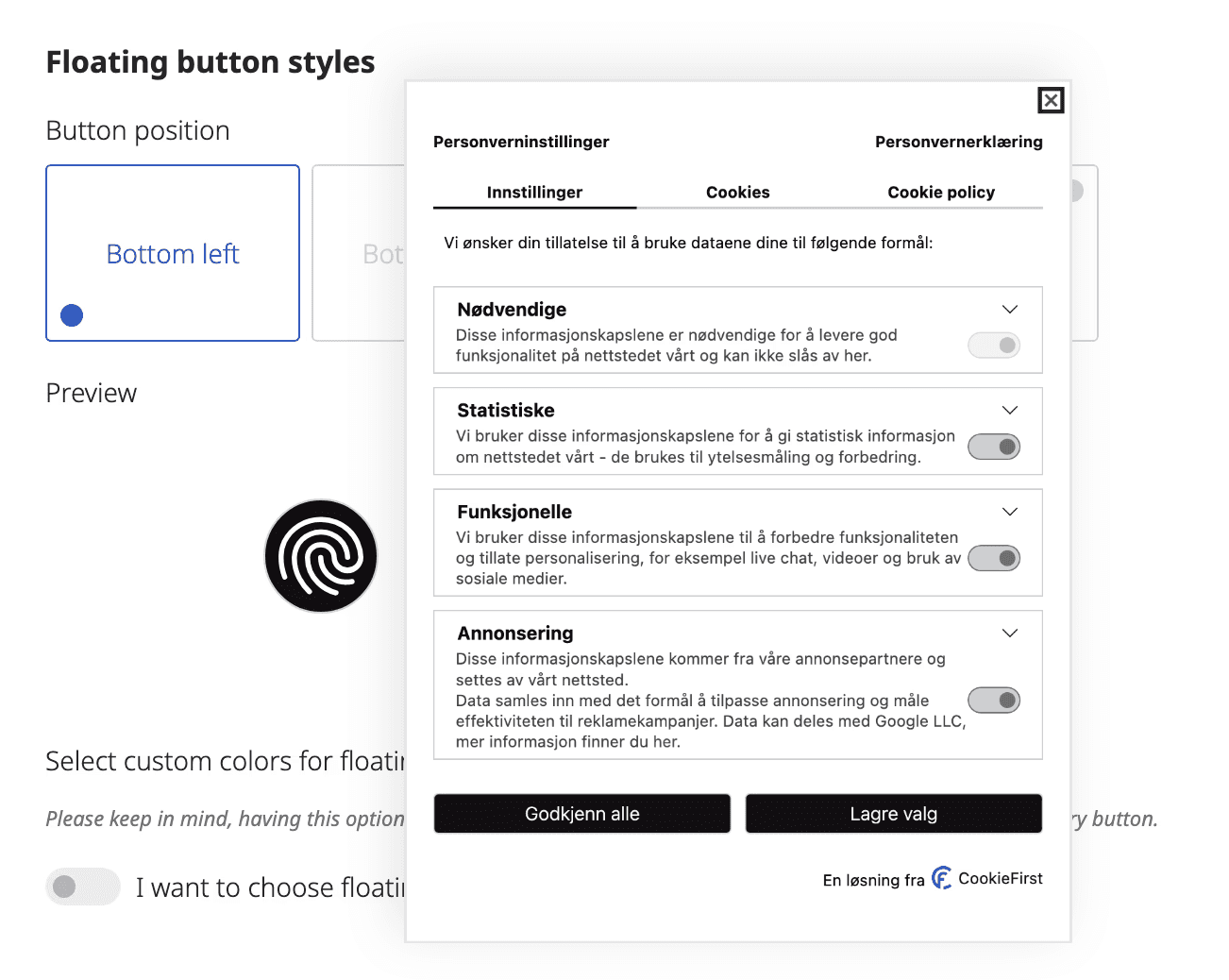 Vi designer et cookiebanner og en samtykkedialog som passer til din merkevare. Med CookieFirst tilpasser vi språk, farger og oppsett – slik at løsningen fremstår profesjonell, brukervennlig og fullt ut compliant.