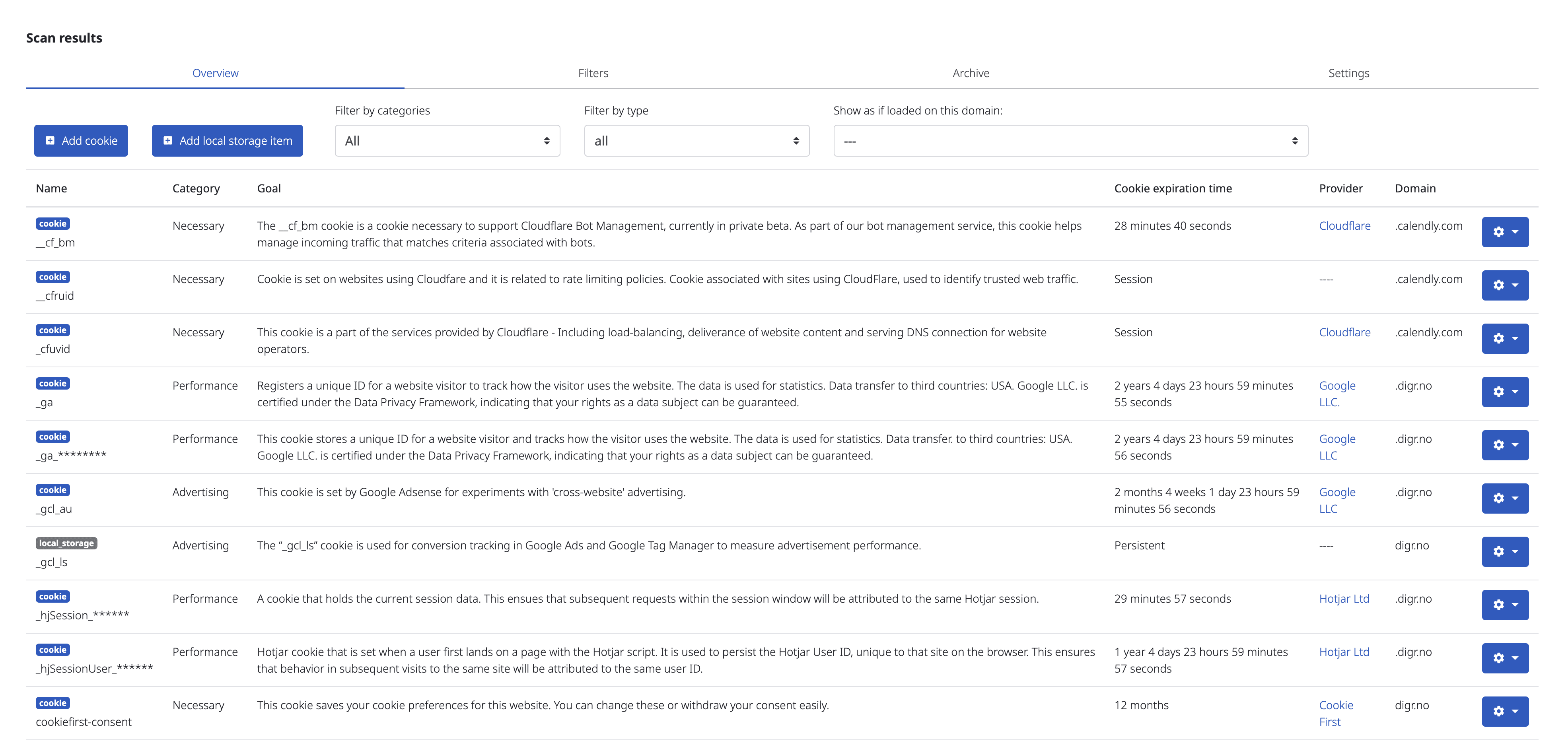 Vi analyserer og kategoriserer alle cookies på nettsiden din med CookieFirst Scanner. Du får full oversikt over hvilke informasjonskapsler som brukes, hva de gjør og hvordan de håndteres – med garanti for at ingen aktiveres uten gyldig samtykke.